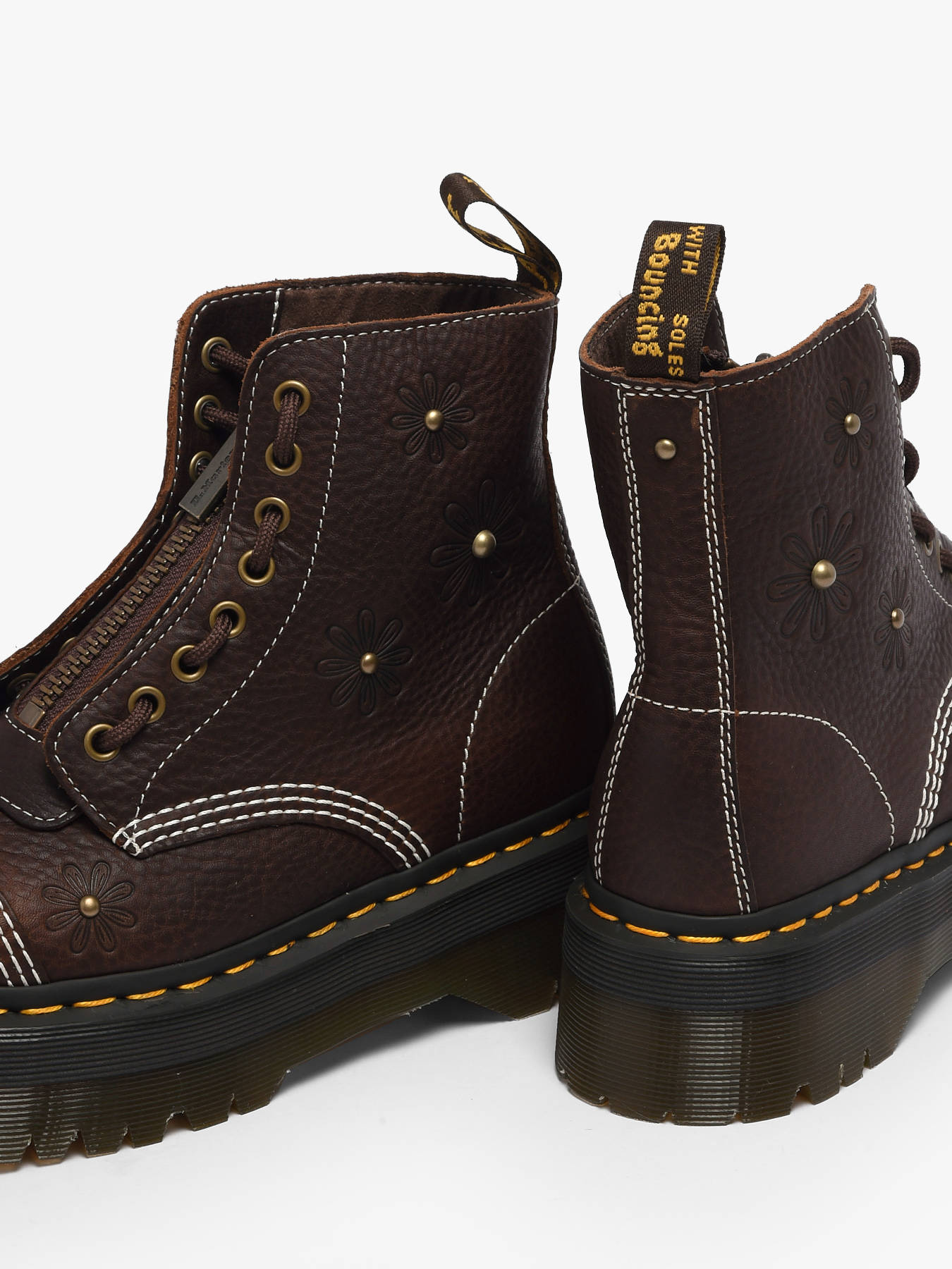 Les boots plateformes Sinclair Flower de Dr Martens en cuir Grizzly marron foncé allient audace, style et caractère pour un look unique. Leur cuir épais au fini grainé subtil se patine avec le temps, révélant une personnalité marquée, tandis que le zip amovible sur le dessus permet un porté personnalisé. Les lacets cordes marron foncé, les finitions vieil or et les détails fleuris gaufrés soulignés de clous dorés apportent contraste et fantaisie sans compromettre robustesse et confort. Reposant sur une semelle plateforme emblématique, avec surpiqûres jaunes et boucle d’enfilage bicolore, ces boots allient solidité et style, devenant une pièce incontournable pour traverser la saison avec audace, esprit espiègle et l’identité rock emblématique de Dr Martens.